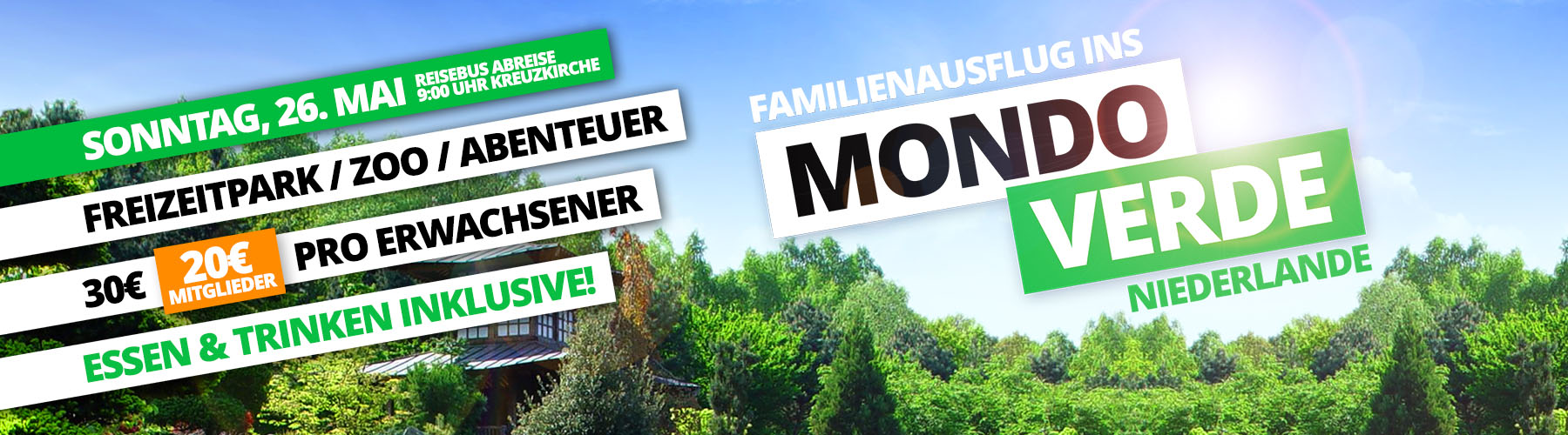 Wir fahren gemeinsam mit dem Reisebus um 9:00 Uhr am üblichen Abfahrtsort (vor dem CVJM-Gebäude in der Nähe der Kreuzkirche, Herne) los. Um 11:00 Uhr öffnet der Park seine Pforten und wir verbringen den ganzen Tag dort. Essen und Getränke sind im Eintrittspreis als All-Inclusive-Flatrate enthalten. Nähere Informationen dazu auf der Informationsseite des Mondo Verde.